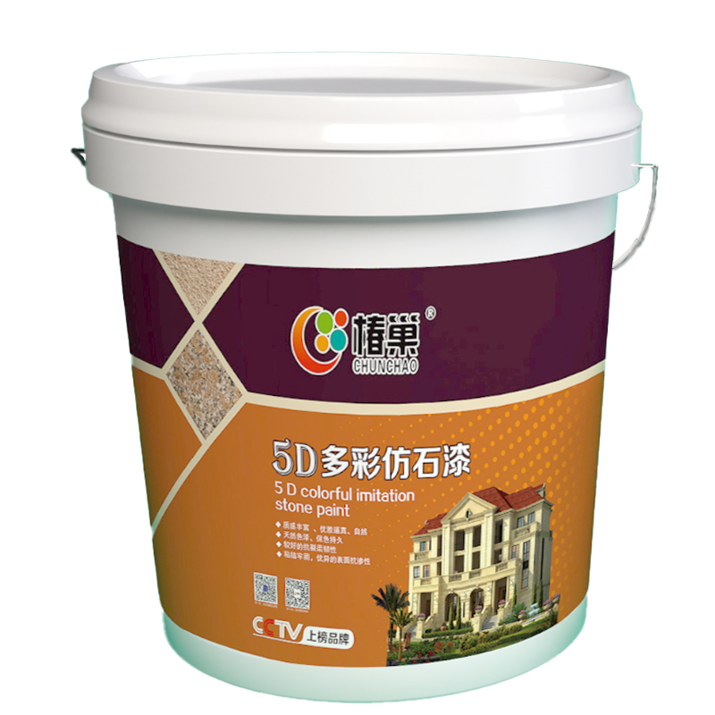 椿巢5D仿石漆即多彩涂料,主要應用于建筑內外墻仿造石材效果,所以又稱液態石,也叫地平線外墻涂料。采用進口高分子乳液、特種助劑與天然石英砂等材料,經特殊工藝將彩色顆粒包裹成粒精制而成。5D仿石漆涂覆后,由于凹凸不平,發生色散可獲得多種顏色花紋、立體感強、光澤優雅、外觀質感好的浮雕狀涂層。它具有耐酸堿、耐水洗、耐污染、耐磨、粘接強度高、不開裂等特性,可涂于灰泥、水泥、石棉、磚、木、金屬的表面,不僅可使建筑美觀,而且減少石材的浪費,自重輕安全性高,是集綠色、環保、節能與安全為一體的墻面裝飾涂料。